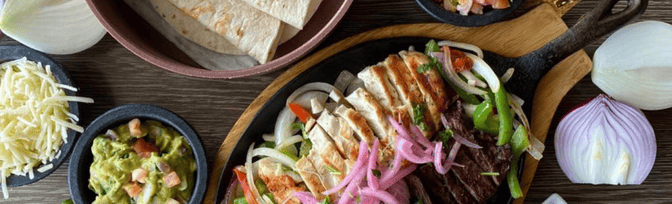 Cebolla y pimientos salteados, guacamole, queso monterrey, crema, pico de gallo, acompañadas de tortillas de harina o maíz.
